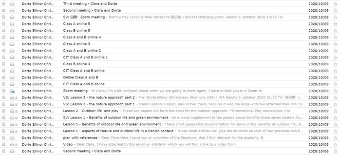 在课程开始前,中丹双方教师通过线上会议、电子邮件等多种方式进行沟通,如环境教育学这门课程的丹麦教师Dorte和中方合作教师於金滟在通过电子邮件交换中丹课程资料和幼儿园现状等情况后,于课程开始前一个星期,每两天开展一次线上交流会议,就课程的内容、补充资料进行深入的探讨和理解,就课程开展方式和所需活动材料进行沟通。
