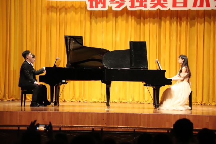 最后,音乐会在张魏威、梁正鹏、音乐系20级马昱彤和李旭冉四位同学的双钢琴八手联弹作品《军队进行曲》中落下帷幕。本场音乐会的成功举办既体现出张魏威和梁正鹏两位同学的刻苦努力与不断求索,也离不开徐寅和郑隽逸两位老师的悉心指导、助力成长,更展现出17级音乐班同学良好的精神风貌。