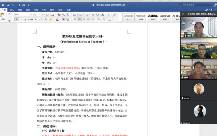 百年大计,教育为本,教育大计,教师为本。加强师范生的师德师风建设,引导师范生以德立身、以德立学、以德施教,是师范专业人才培养的重中之重。2021年11月21日,小学教育系思政示范课《教师职业道德》教学研讨会以网络会议的形式顺利举行,参加这次研讨会的有学校马克思主义学院姚彦琳博士、必一运动小学教育系谢国忠副教授、缪周芬副教授,必一运动学工办主任刘成娟,研讨活动由课程负责人王雅丽主持。