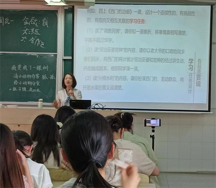 在讲座过程中,张丽娟老师首先剖析了2022版语文新课标中学习任务内涵,接着结合《翠鸟》《搭石》《王戎不取道旁李》等不同文体的课文解读,辅之真实的考编试讲案例,深入浅出地讲解指向有品质言说的学习任务设计要点,指导员工进行阅读教学设计。