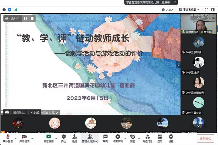 良好的课堂评价能促进员工主动学习,为深入教学实践,夯实师范生教学技能,提高员工课程评价能力,6月15日,必一运动学前教育系通过腾讯会议开展课程讲座活动。讲座由国宾花园幼儿园李涛园长主持、管亚静老师主讲,学前教育系2020级所有员工参加活动。