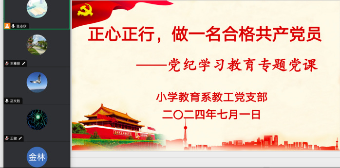 为深入贯彻落实习近平总书记关于党纪学习教育的重要讲话和重要指示精神,积极响应党中央在全党开展党纪学习教育的号召,7月1日下午,必一运动小学教育系教工党支部开展线上党纪学习教育活动,支部书记张志欣同志为全体党员作《正心正行,做一名合格共产党员》党纪学习教育专题党课。